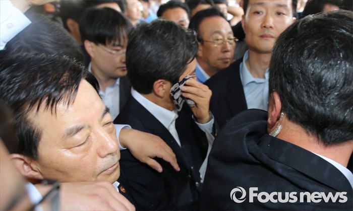 (성주=포커스뉴스) 황교안 국무총리가 15일 오전 경북 성주군청광장에서 사드(THAAD, 고고도미사일방어체계) 배치에 대한 주민설명회에서 주민이 던진 물병에 맞고 손수건으로 얼굴을 닦고 있다.