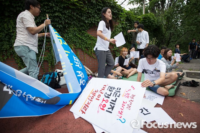 (서울=포커스뉴스) 좋은 대한민국 만들기 대학생 운동본부' 소속 학생들이 15일 오전 서울 용산 미군 기지 앞에서 '사드 배치 반대 48시간 대학생 긴급농성 선포' 기자회견을 마친 후 농성에 들어가고 있다.