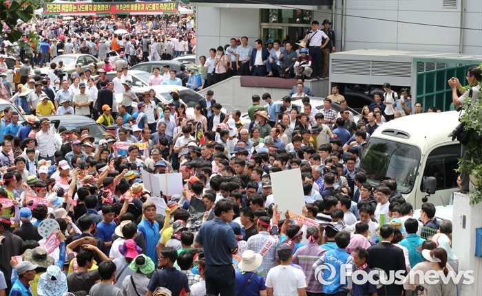 (성주=포커스뉴스) 황교안 국무총리와 한민구 국방부장관이 15일 오전 경북 성주군청광장에서 사드(THAAD, 고고도미사일방어체계) 배치에 대한 주민설명회를 가진 가운데 성난 주민이 황 총리가 탄 버르를 막고 있다.