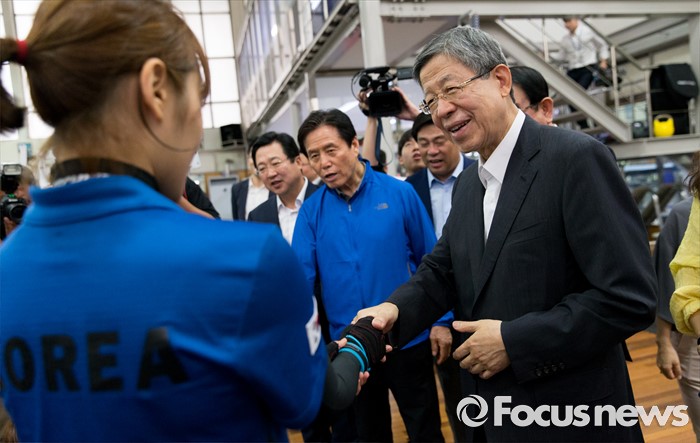 (서울=포커스뉴스) 김희옥 새누리당 혁신비상대책위원장이 15일 오전 서울 노원구 태릉선수촌을 방문해 리우올림픽에 출전하는 선수들을 격려하고 있다.