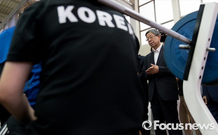 (서울=포커스뉴스) 김희옥 새누리당 혁신비상대책위원장이 15일 오전 서울 노원구 태릉선수촌을 방문해 리우올림픽에 출전하는 선수들을 격려하고 있다.