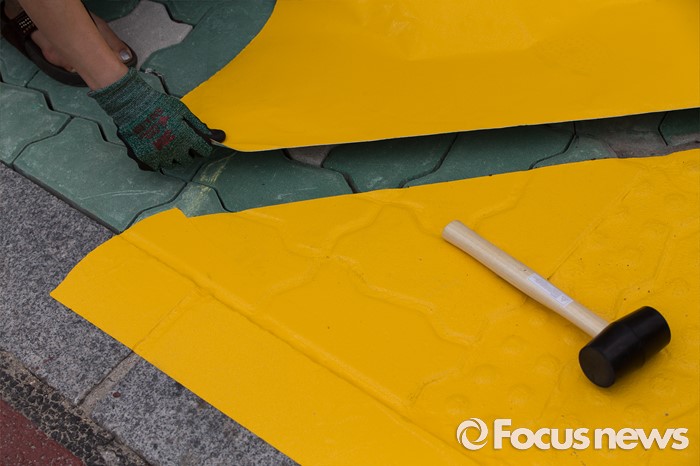 (서울=포커스뉴스) 15일 오전 서울 성북구 안암초등학교 앞에서 열린 아동안전 프로젝트 '옐로카펫' 제작행사에 참여한 학부모 및 행사 관계자들이 카펫을 설치하고 있다.