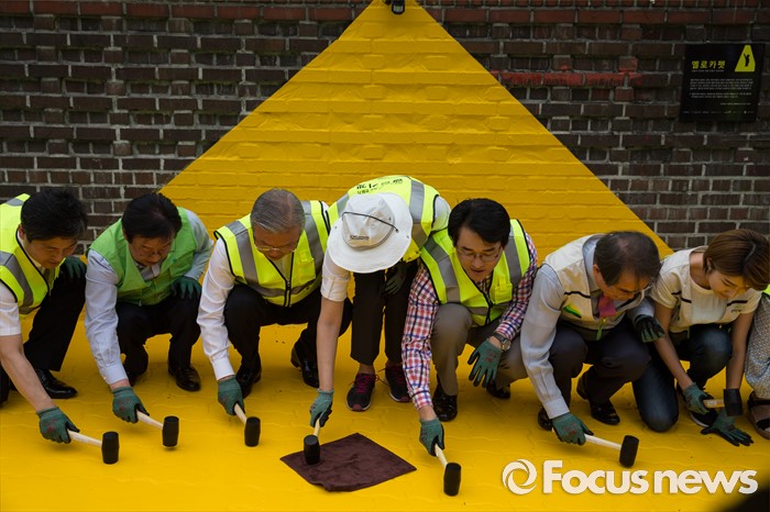 (서울=포커스뉴스) 김종인(왼쪽 세 번째) 더불어민주당 비상대책위원회 대표가 15일 오전 서울 성북구 안암초등학교 앞에서 열린 아동안전 프로젝트 '옐로 카펫' 제작행사에 참여해 관계자들과 카펫을 설치하고 있다.