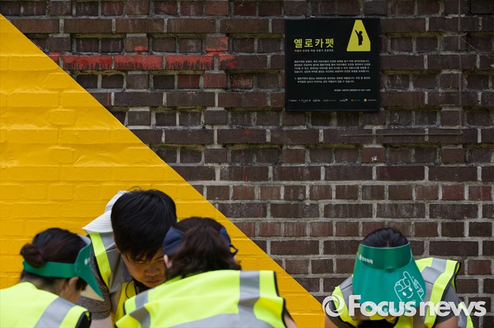 (서울=포커스뉴스) 15일 오전 서울 성북구 안암초등학교 앞에서 열린 아동안전 프로젝트 '옐로카펫' 제작행사에 참여한 학부모 및 행사 관계자들이 카펫을 설치하고 있다.