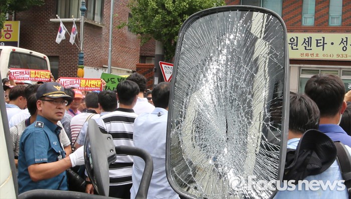 (성주=포커스뉴스) 황교안 국무총리가 15일 오전 경북 성주군청광장에서 사드(THAAD, 고고도미사일방어체계) 배치에 대한 주민설명회를 마치고 차량으로 오르자 차량의 사이드미러가 깨져 있다.