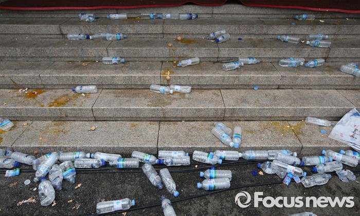(성주=포커스뉴스) 황교안 국무총리와 한민구 국방부장관이 15일 오전 경북 성주군청광장에서 사드(THAAD, 고고도미사일방어체계) 배치에 대한 주민설명회를 마치고 떠난 자리에 물병과 깨진 계란이 바닥에 뒤섞여 있다.