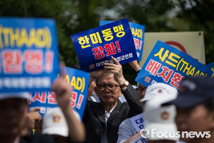 (서울=포커스뉴스) 15일 오전 서울 용산 국방부 앞에서 재향군인회 회원들 및 관계자들이 사드 배치 환영 기자회견을 하고 있다.