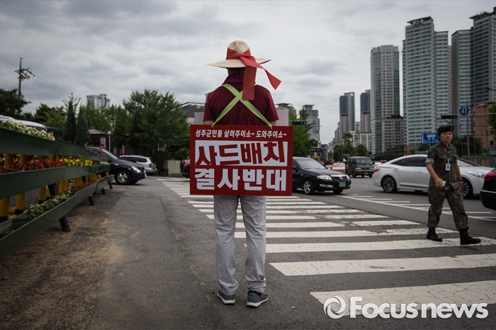 (서울=포커스뉴스) 경북 성주군민이 15일 오후 서울 용산구 국방부 앞에서 사드 성주 배치를 반대하는 1인 시위를 하고 있다.