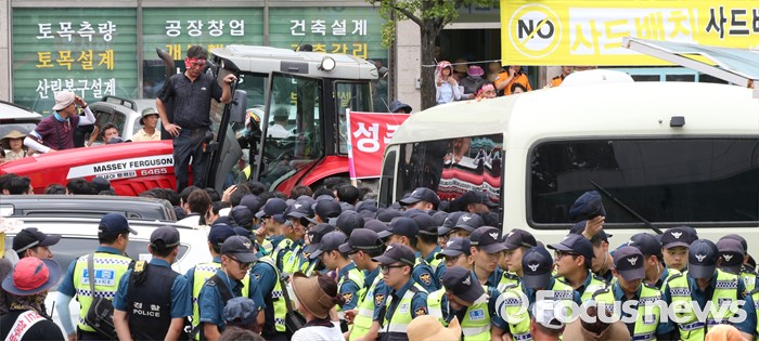 이에 경찰 100여 명이 긴급 동원, 군민들의 접근을 막았지만 대치가 이어졌고 군민들은 오후 2시쯤 트랙터 2대를 끌고와 버스를 출구를 봉쇄하며 황 총리 일행이 탄 버스는 4시간째 갇혀있다.황교안 국무총리와 한민구 국방부장관이 15일 오전 경북 성주군청광장에서 사드(THAAD, 고고도미사일방어체계) 배치에 대한 주민설명회를 마치고 차량에 오르자 주민들이 트렉터를 동원해 차량을 막고 항의하고 있다. 2016.07.15 김기태 기자 황교안 국무총리와 한민구 국방부장관이 15일 오전 경북 성주군청광장에서 사드(THAAD, 고고도미사일방어체계) 배치에 대한 주민설명회를 마치고 차량에 오르자 주민들이 트렉터를 동원해 항의하고 있다. 2016.07.15 김기태 기자