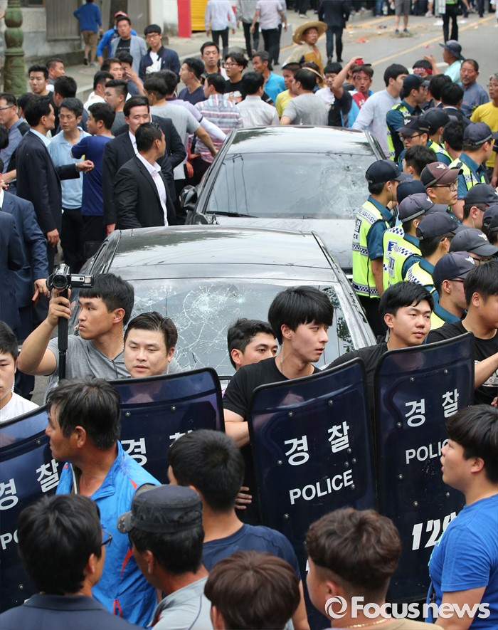 (성주=포커스뉴스) 황교안 국무총리와 한민구 국방부장관이 15일 경북 성주군청광장에서 사드(THAAD, 고고도미사일방어체계) 배치에 대한 주민설명회를 마치고 차량에 갖혀 6시간 넘게 대치중 버스에서 내려 승용차로 빠져나가려 하자 성주 주민들이 총리가 탑승한 차량을 막고 있다.