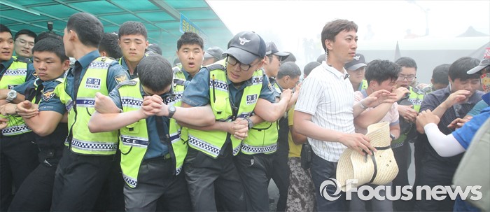 (성주=포커스뉴스) 황교안 국무총리와 한민구 국방부장관이 15일 경북 성주군청광장에서 사드(THAAD, 고고도미사일방어체계) 배치에 대한 주민설명회를 마치고 차량에 갖혀 6시간 넘게 대치중 버스에서 내려 승용차로 빠져나가려 하자 성주 주민들과 경찰이 몸싸움을 하고 있다.