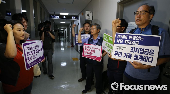 (세종=포커스뉴스) 15일 저녁 세종시 정부세종청사 고용노동부에서 열린 최저임금위원회 제13차 전원회의에서 근로자 위원들이 운영위원회와 논의하지 않은 일방적인 회의 진행으로 심의에 동참할 수 없다고 밝히고 구호를 외치고 있다.