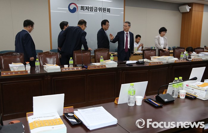 (세종=포커스뉴스) 15일 저녁 세종시 정부세종청사 고용노동부에서 열린 최저임금위원회 제13차 전원회의에서 박준성 위원장이 공익위원들과 회의장을 나서고 있다.
