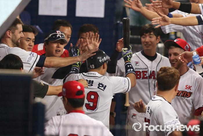 (서울=포커스뉴스) 16일 서울 고척 스카이돔에서 열린 2016 프로야구 올스타 경기에서 드림팀 민병헌이 1회말 좌월 솔로 홈런을 치고 더그아웃에서 동료들의 축하를 받고 있다.