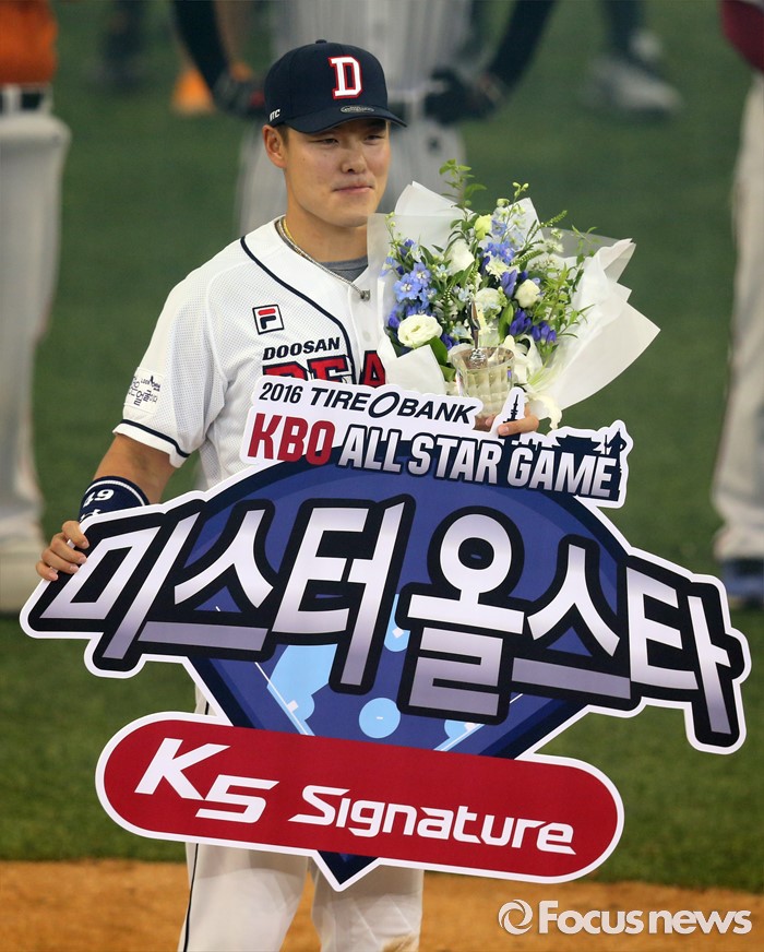 (서울=포커스뉴스) 16일 서울 고척 스카이돔에서 열린 2016 프로야구 올스타전에서 MVP로 선정된 드림팀의 민병헌이 포즈를 취하고 있다.