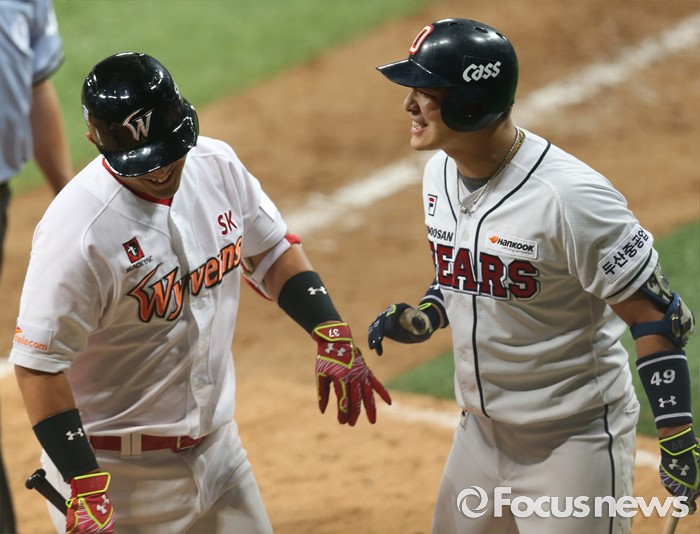 (서울=포커스뉴스) 16일 서울 고척 스카이돔에서 열린 2016 프로야구 올스타 경기 7회말 1사후 드림팀 정의윤이 두 타자 연속 좌월 솔로 홈런을 치고 홈인하며 민병헌의 환영을 받고 있다.
