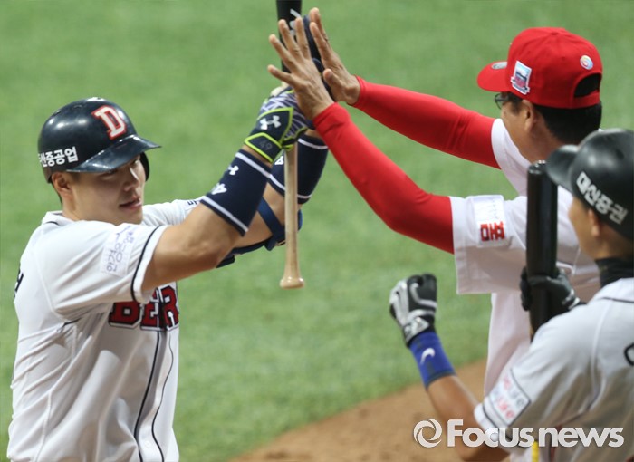 (서울=포커스뉴스) 16일 서울 고척 스카이돔에서 열린 2016 프로야구 올스타 경기 7회말 1사후 드림팀 민병헌이 세 타자 연속 좌월 솔로 홈런을 치고 김용희 감독의 환영을 받으며 홈인하고 있다.