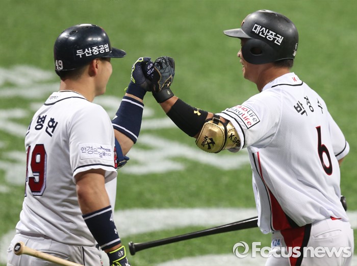 (서울=포커스뉴스) 16일 서울 고척 스카이돔에서 열린 2016 프로야구 올스타 경기 7회말 1사후 드림팀 박경수가 좌월 솔로 홈런을 치고 민병헌의 환영을 받으며 홈인하고 있다.