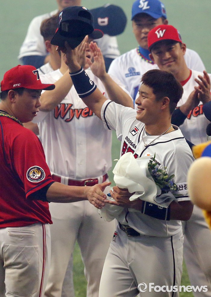 (서울=포커스뉴스) 16일 서울 고척 스카이돔에서 열린 2016 프로야구 올스타전에서 MVP로 선정된 드림팀의 민병헌이 모자를 벗어 인사하고 있다.