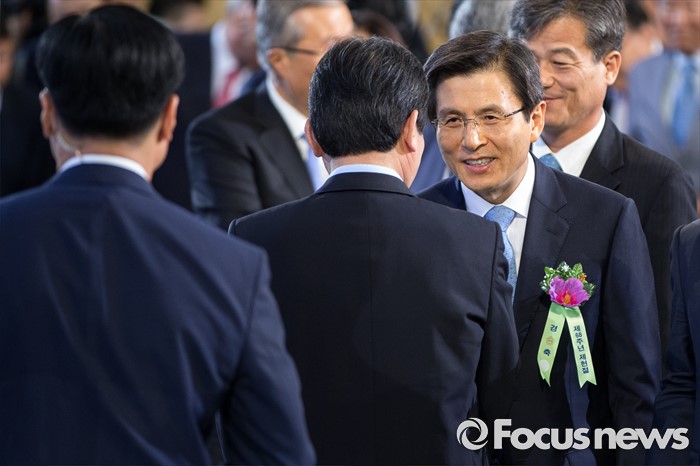 (서울=포커스뉴스) 황교안 국무총리가 17일 오전 서울 영등포구 여의도 국회의사당 중앙홀에서 열린 제68주년 제헌절 경축식에 참석해 정세균 국회의장과 악수하고 있다.