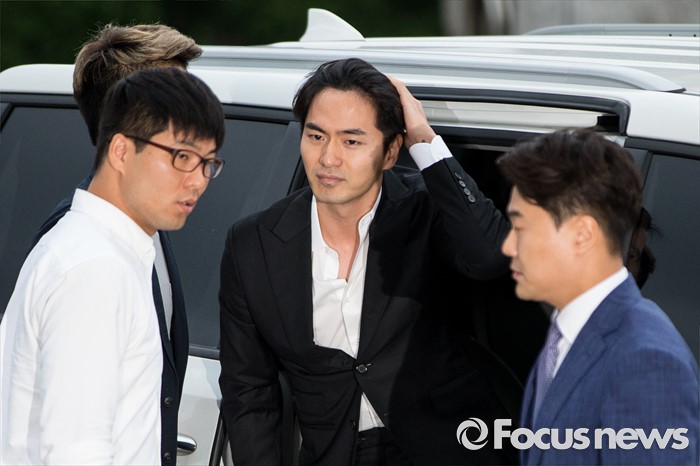 (서울=포커스뉴스) 성폭행 혐의로 피소된 배우 이진욱(가운데)이 17일 오후 서울 강남구 수서경찰서로 출석하고 있다.