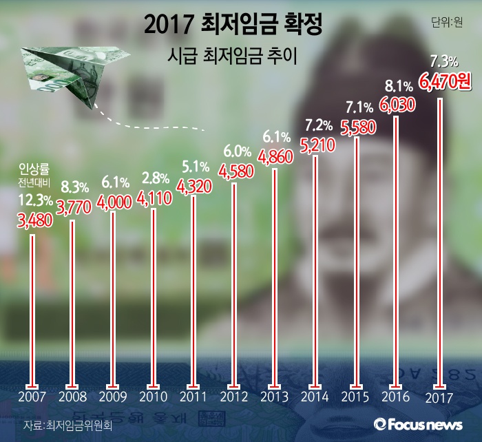 (서울=포커스뉴스) 최저임금위원회는 16일 2017년 시간당 최저임금을 올해보다 7.3%(440원) 오른 6470원으로 결정했다.