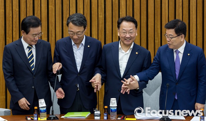 (서울=포커스뉴스) 여야3당 정책위의장과 경제부총리가 18일 오전 서울 여의도 국회에서 열린 '3당 정책위의장-경제부총리, 3차 민생경제 현안점검회의'에 참석해 사진촬영 하고 있다. 왼쪽부터 변재일 더불어민주당 정책위의장, 김성식 국민의당 정책위의장, 유일호 경제부총리 겸 기획재정부 장관, 김광림 새누리당 정책위의장.