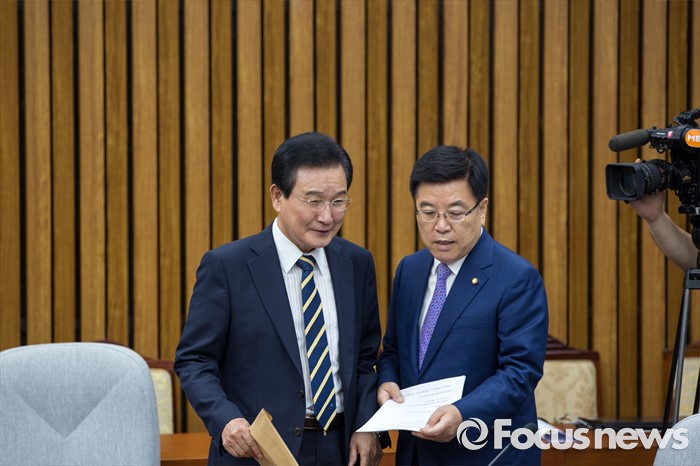 (서울=포커스뉴스) 김광림(오른쪽) 새누리당 정책위의장과 변재일 더불어민주당 정책위의장이 18일 오전 서울 여의도 국회에서 열린 '3당 정책위의장-경제부총리, 3차 민생경제 현안점검회의'에 참석하기 위해 회의실로 들어서고 있다.