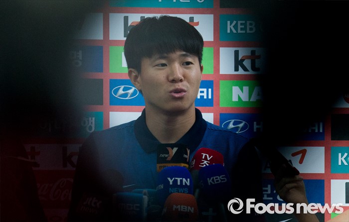 (인천공항=포커스뉴스) 2016년 리우데자네이루 올림픽 메달에 도전하는 올림픽 축구 국가대표팀 권창훈이 18일 오후 인천국제공항에서 브라질 상파울루로 출국하기 전 취재진 질문에 답하고 있다.