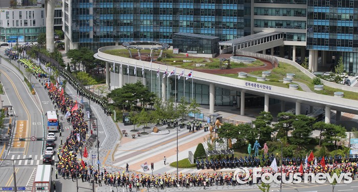 (세종=포커스뉴스) 전국건설기계연합회 구성원들이 18일 오후 세종시 정부세종청사 국토교통부 앞에서 굴삭기 수급조절을 통해 임대사업자를 보호할 것을 촉구하며 가두행진을 하고 있다.