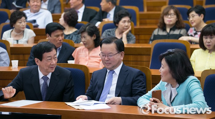 (서울=포커스뉴스) 18일 오후 서울 여의도 국회 헌정기념관에서 한국적 제3의 길 후원으로 열린 '개헌을 말하다 의원 대담, 어떤 헌법인가?'에 참석한 박영선(오른쪽부터), 김부겸, 진영 더불어민주당 의원이 대화하고 있다.
