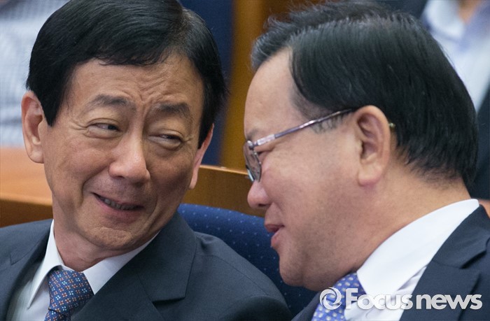 (서울=포커스뉴스) 18일 오후 서울 여의도 국회 헌정기념관에서 한국적 제3의 길 후원으로 열린 '개헌을 말하다 의원 대담, 어떤 헌법인가?'에 참석한 김부겸(오른쪽), 진영 더불어민주당 의원이 대화하고 있다.