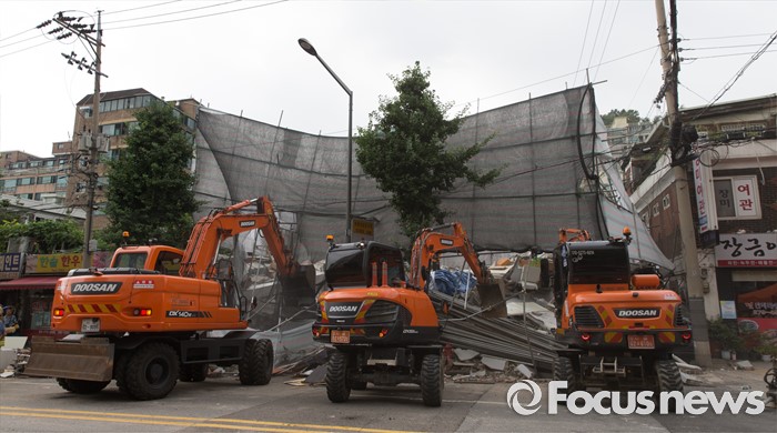 (서울=포커스뉴스) 18일 오후 서울 서대문구 홍은동 한 공사장에서 붕괴사고가 일어나 소방대원들이 구조작업을 벌이고 있다. 소방당국은 붕괴된 건물 지하에 1명이 매몰되어 있다고 밝혔다.