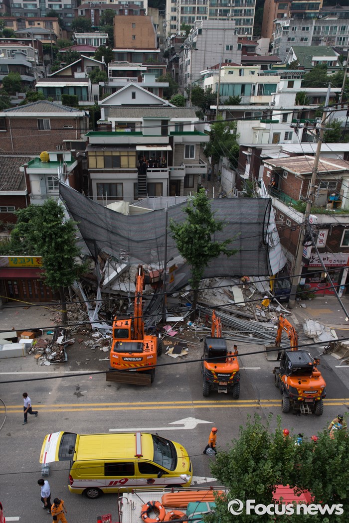 (서울=포커스뉴스) 18일 오후 서울 서대문구 홍은동 한 공사장에서 붕괴사고가 일어나 소방대원들이 구조작업을 벌이고 있다. 소방당국은 붕괴된 건물 지하에 1명이 매몰되어 있다고 밝혔다.