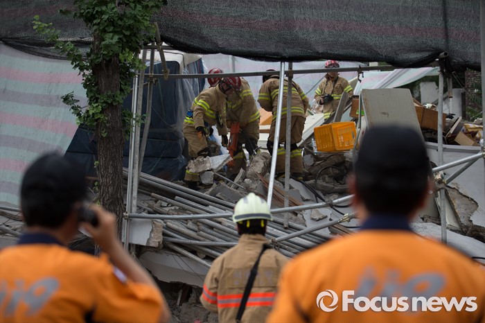 (서울=포커스뉴스) 18일 오후 서울 서대문구 홍은동 한 공사장에서 붕괴사고가 일어나 소방대원들이 구조작업을 벌이고 있다. 소방당국은 붕괴된 건물 지하에 1명이 매몰되어 있다고 밝혔다.