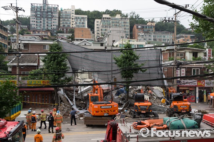 (서울=포커스뉴스) 18일 오후 서울 서대문구 홍은동 한 공사장에서 붕괴사고가 일어나 소방대원들이 구조작업을 벌이고 있다. 소방당국은 붕괴된 건물 지하에 1명이 매몰되어 있다고 밝혔다.