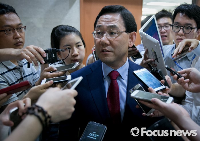 (서울=포커스뉴스) 전당대회 출마를 선언한 주호영 새누리당 의원이 18일 오후 서울 여의도 국회 정론관에서 추가로 공개된 윤상현 의원의 공천개입 녹취록과 관련 성명서를 발표한 뒤 취재진 질문에 답하고 있다.