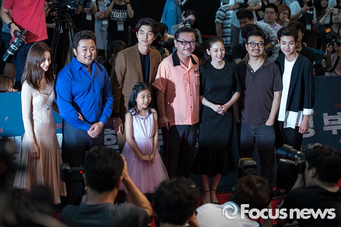 (서울=포커스뉴스) 18일 오후 서울 영등포구 타임스퀘어에서 열린 영화 '부산행' 레드카펫 행사에 참석한 배우들과 감독이 취재진을 향해 포즈를 취하고 있다.