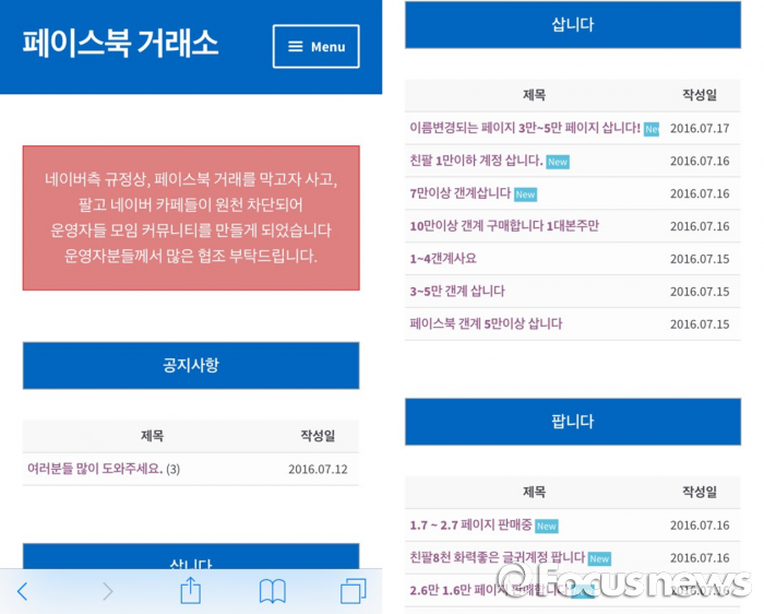 페이스북코리아의 실명인증 정책을 우회하는 '편법'에 대해서는 "그런 사례가 있다고 해서 (실명인증 절차를 강화하는) 별도의 프로세스를 만든다면, 대다수의 다른 이용자들이 불편을 겪게 된다"며 "(편법을 사용하더라도) 2~3개월 안에 반드시 적발되기 때문에 수동 적발을 통해 걸러내는 것이 좋다"고 밝혔다.'페이스북 거래소' 웹사이트. 게시판만 자리를 잡고 있고 '삽니다' '팝니다' 게시판에 글이 올라오고 있다.16만명이 '좋아요' 등록하고 있는 페이스북 페이지를 판매하겠다는 게시글. 카카오톡 ID가 함께 적혀있다.