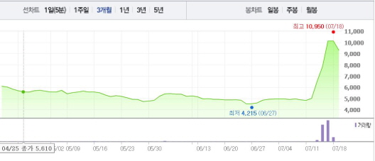 이는 일주일 전 주가인 12일(5040원)과 비교했을 때 84.9% 상승한 수치다.