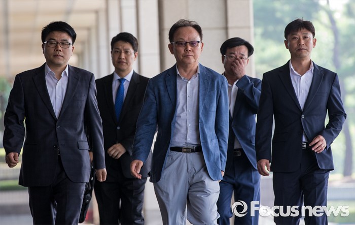 (서울=포커스뉴스) 롯데케미칼 270억원대 소송 사기에 연루된 혐의를 받는 기준(가운데) 전 롯데물산 사장이 19일 오전 서울중앙지검에 피의자 신분으로 출석하고 있다.