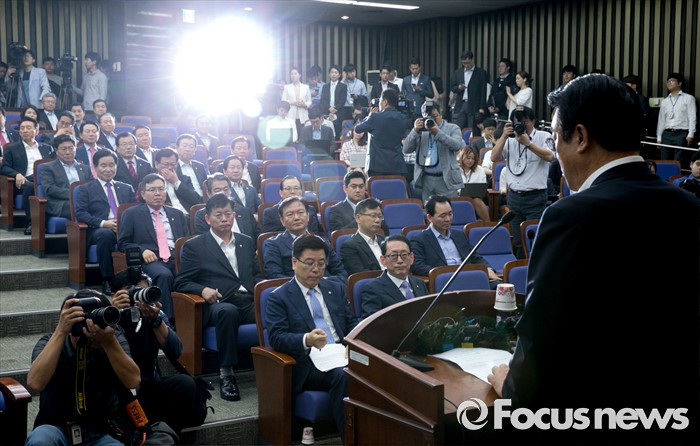 (서울=포커스뉴스) 19일 오전 서울 여의도 국회에서 열린 새누리당 의원총회에 참석한 의원들의 정진석 원내대표의 모두발언을 듣고 있다.