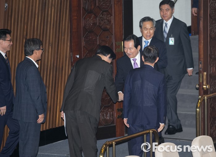 (서울=포커스뉴스) 19일 오전 서울 여의도 국회에서 열린 344회 국회(임시회) 1차 본회의, 사드(THAAD·고고도미사일방어체계) 배치에 대한 긴급현안질문에 참석한 정세균 국회의장이 윤병세 외교부 장관, 한민구 국방부 장관과 인사하고 있다.