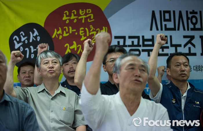 (서울=포커스뉴스) 19일 오전 서울 중구 민주노총 대회의실에서 시민 사회 공동행동 출범 및 공공부문노조 파업 돌입 선언 기자회견이 열리고 있다. 공공성 강화와 공공부문 성과·퇴출제 저지 시민사회공동 행동은 9월 27일까지 성과연봉제, 민영화 정책 중단이 없으면 공공기관 노동자 6만명이 무기한 전면 파업에 들어가겠다고 밝혔다.