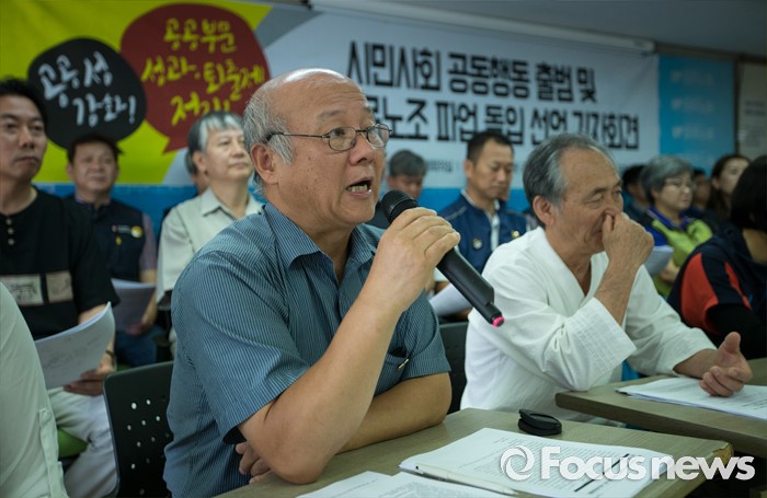 (서울=포커스뉴스) 19일 오전 서울 중구 민주노총 대회의실에서 시민 사회 공동행동 출범 및 공공부문노조 파업 돌입 선언 기자회견이 열리고 있다. 공공성 강화와 공공부문 성과·퇴출제 저지 시민사회공동 행동은 9월 27일까지 성과연봉제, 민영화 정책 중단이 없으면 공공기관 노동자 6만명이 무기한 전면 파업에 들어가겠다고 밝혔다.