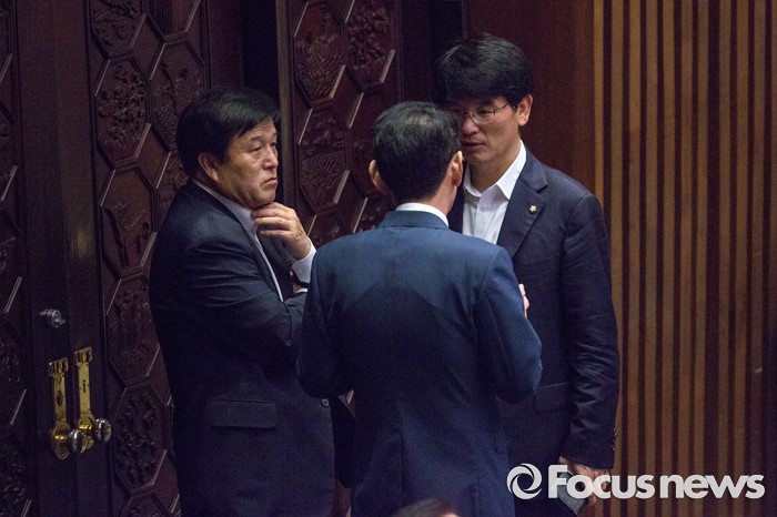 (서울=포커스뉴스) 김도읍(가운데) 새누리당 원내수석부대표와 박완주(오른쪽) 더불어민주당 원내수석부대표가 19일 오전 서울 여의도 국회에서 열린 제344회 국회(임시회) 1차 본회의, 사드(THAAD, 고고도미사일방어체계) 배치에 대한 긴급현안질문에 참석해 대화 하고 있다.