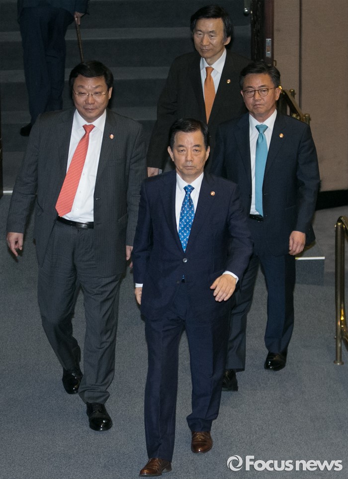 (서울=포커스뉴스) 19일 오전 서울 여의도 국회에서 344회 국회(임시회) 1차 본회의, 사드(THAAD·고고도미사일방어체계) 배치에 대한 긴급현안질문을 마친 뒤 한민구 국방부 장관, 홍용표 통일부 장관, 윤병세 외교부 장관, 주형환 산업통상자원부 장관이 퇴장하고 있다.