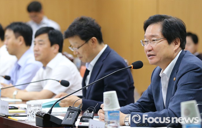 (세종=포커스뉴스) 김영석(오른쪽) 해양수산부장관이 19일 오후 세종시 정부세종청사 해양수산부 대회의실에서 열린 제4차 수산물 수출대책회의에 참석해 회의를 주재하고 있다.