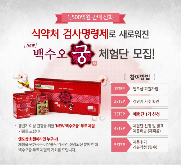 내츄럴엔도텍 관계자는 "갱년기 여성 삶의 질 향상에 도움을 줬던 '백수오궁'이 더욱 깐깐한 과정을 통해 믿을 수 있는 제품으로 출시돼 제품 체험 기회를 확대하고자 이런 기회를 마련했다"며 "체험단의 생생한 후기를 통해 제품을 효과적으로 알리고 체험단 뿐 아니라 진품 백수오 농장체험 등 소비자 의견을 직접 수렴할 수 있는 기회를 확대해 나갈 예정"이라고 말했다.