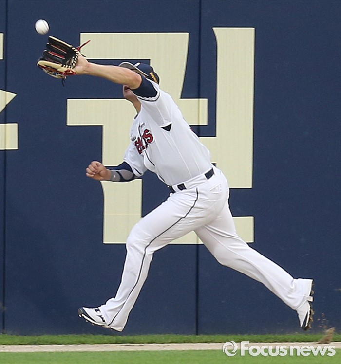 (서울=포커스뉴스) 19일 서울 잠실구장에서 열린 2016 프로야구 삼성두산 경기 4회초 2사 3루에서 두산 좌익수 김재환이 삼성 최형우의 외야플라이를 펜스 앞에서 잡고 있다.